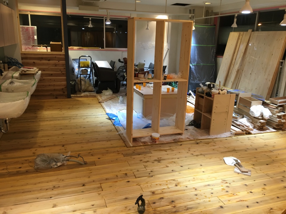 徐々に内装が完成されていきます!一番の収穫は、スタッフ達と過ごす時間、同じ目的に向かう姿勢。創業以来の一体感を感じながらのDIYです。