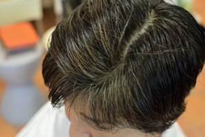 ハーバルブラウンを塗布し45分〜60分放置します。その後、洗い流します。そうすると、白髪部分が浮いたような色になり、しかも少しグリーンぽい色になります。